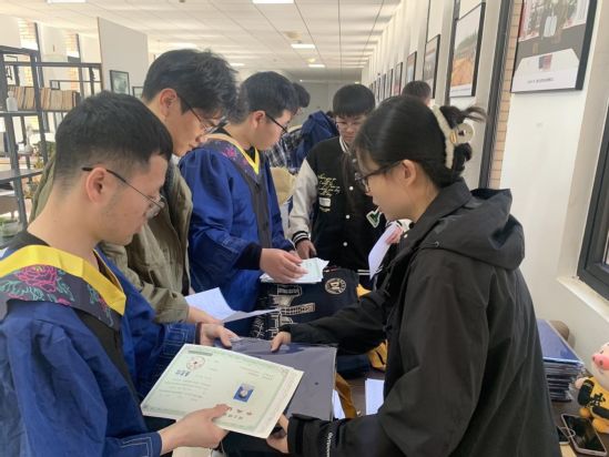 在电气楼大厅,离校手续办理点秩序井然。毕业生们依次提交材料、归还学位服、领取毕业证和学位证。一张张红色的证书,承载着三年的奋斗与成长。